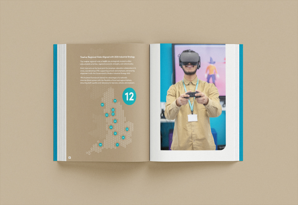 Brand strategy & protection: Name development and trademark registration advice. Brand identity: Concept, logo design, and full supporting usage guidelines. Brand consistency: Development of the written style IndEX for standout recognition. Publishing & storytelling: Design of IndEX: Bridging the Gap Between Industry & Education book for print, interactive PDF, and Amazon e-publishing. Digital presence: Website architecture, UX & UI design, front-end and CMS build, content management and secure hosting. Visual communication: On-brand infographic design for digital and print. Brand stewardship: Ongoing curation and rollout across all touchpoints.